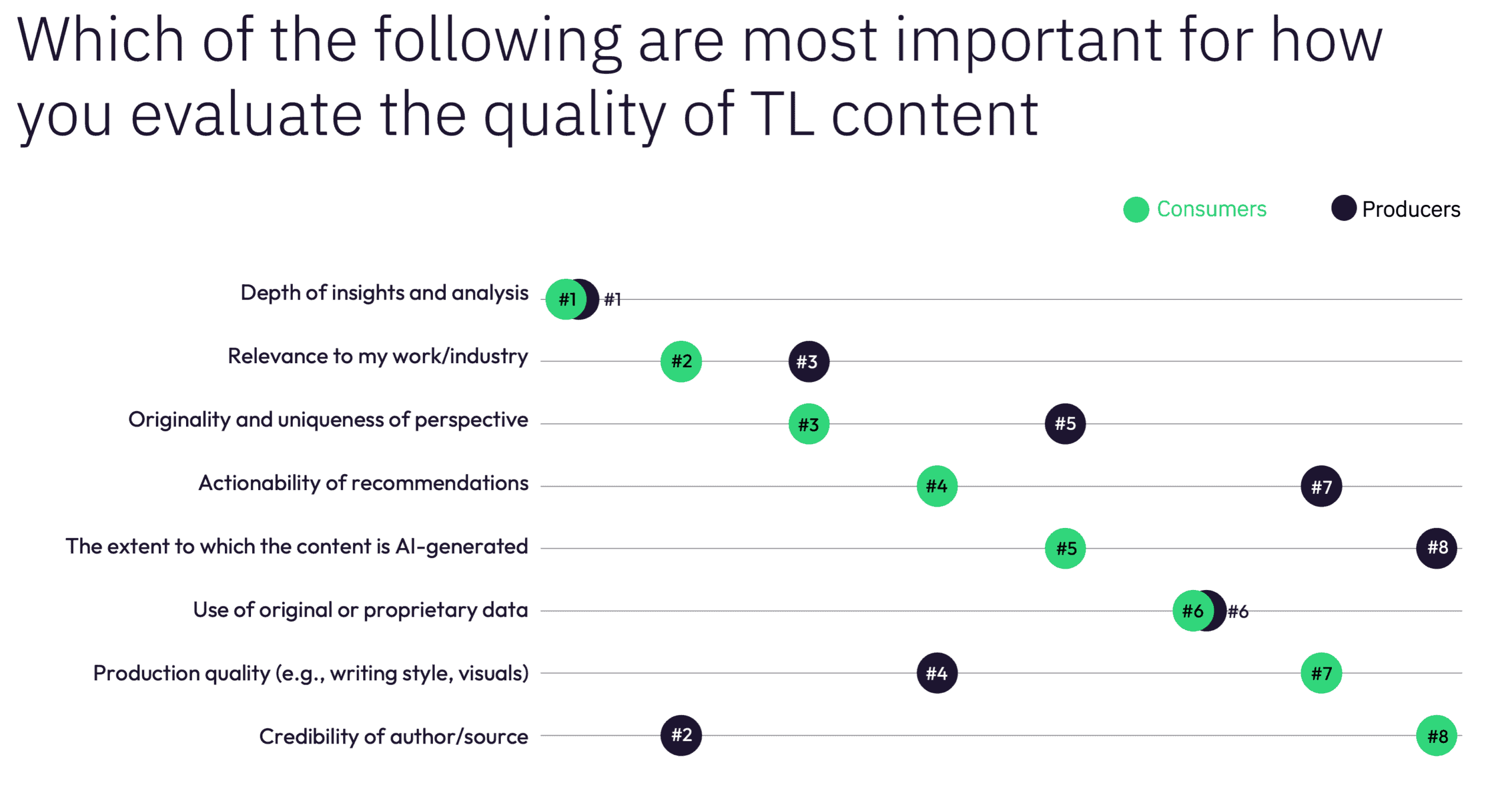 Beyond that, the way consumers and producers define quality is only partially aligned. More than 70% of executive consumers ranked originality, delivering a unique perspective, and use of proprietary data as key characteristics of thought leadership quality, compared to a lower proportion of producers.