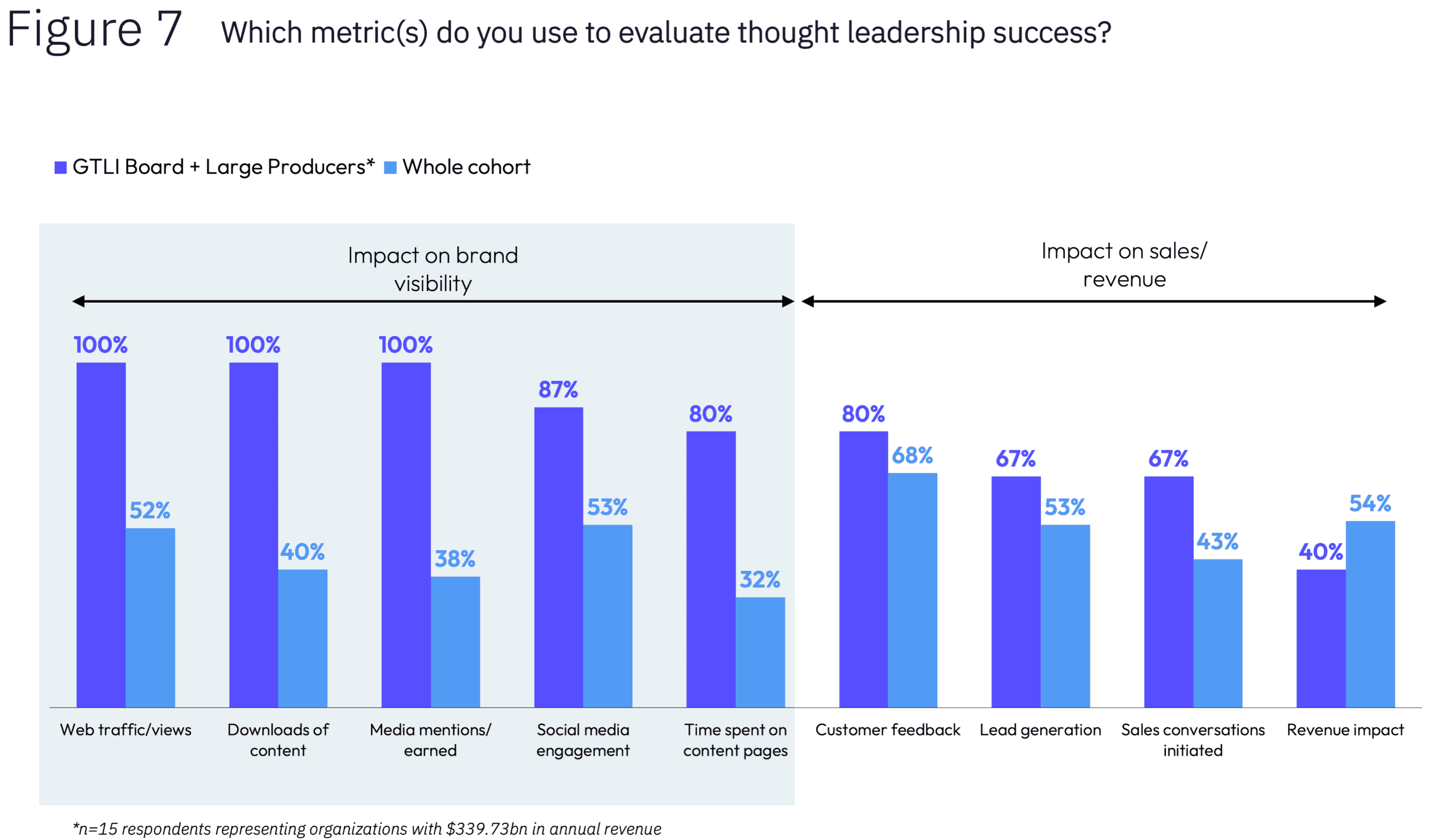 Almost all (95%) of thought leadership producers have a formal process for measuring the performance of their content. Larger and more mature producers tend to emphasize brand visibility metrics including web traffic, downloads, and earned media engagement, while the total respondent set prioritizes commercial impact, including lead generation and sales conversions. But there is still much room for improvement and alignment in the measurement of thought leadership impact.